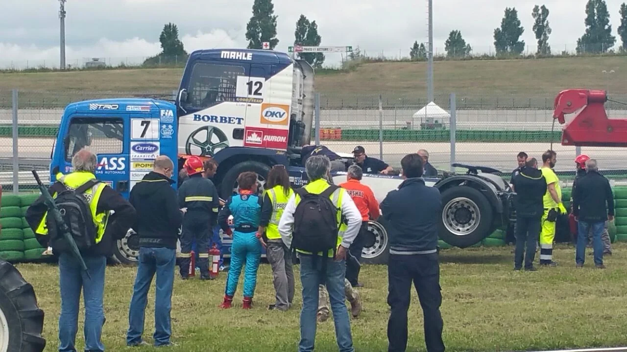 Im Warm up gab es dann gleich die erste Aufregung, nachdem sich Ellen Lohr von hinten auf den Truck von Rene Reinert geschoben hat und praktisch voll aufgesessen hat. Zum Glück ist beiden Fahrern nix passiert, aber an Rennen ist erstmal nicht zu denken.